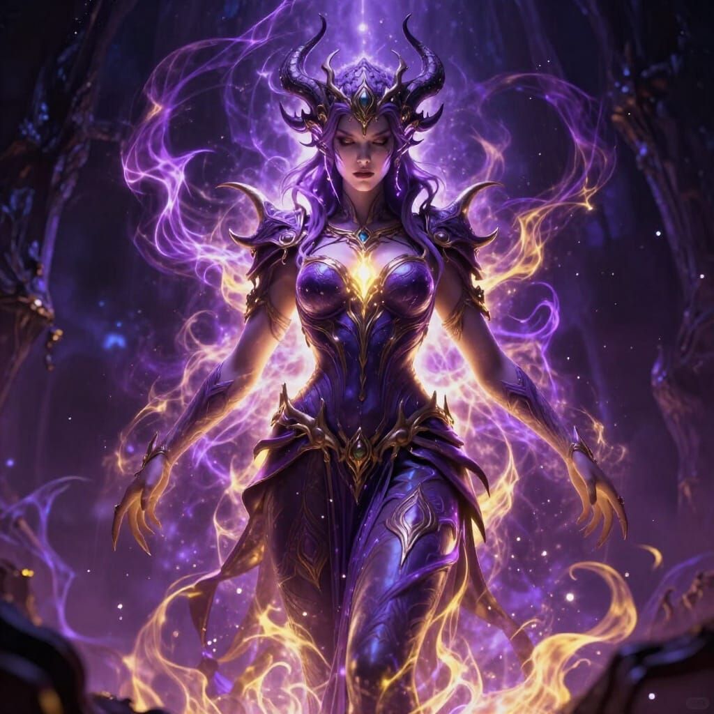 This image features a hyperdetailed dark fantasy concept art of a powerful female deity radiating astro energy. The art style is reminiscent of Unreal Engine renders with vibrant purple and yellow complementary colors.