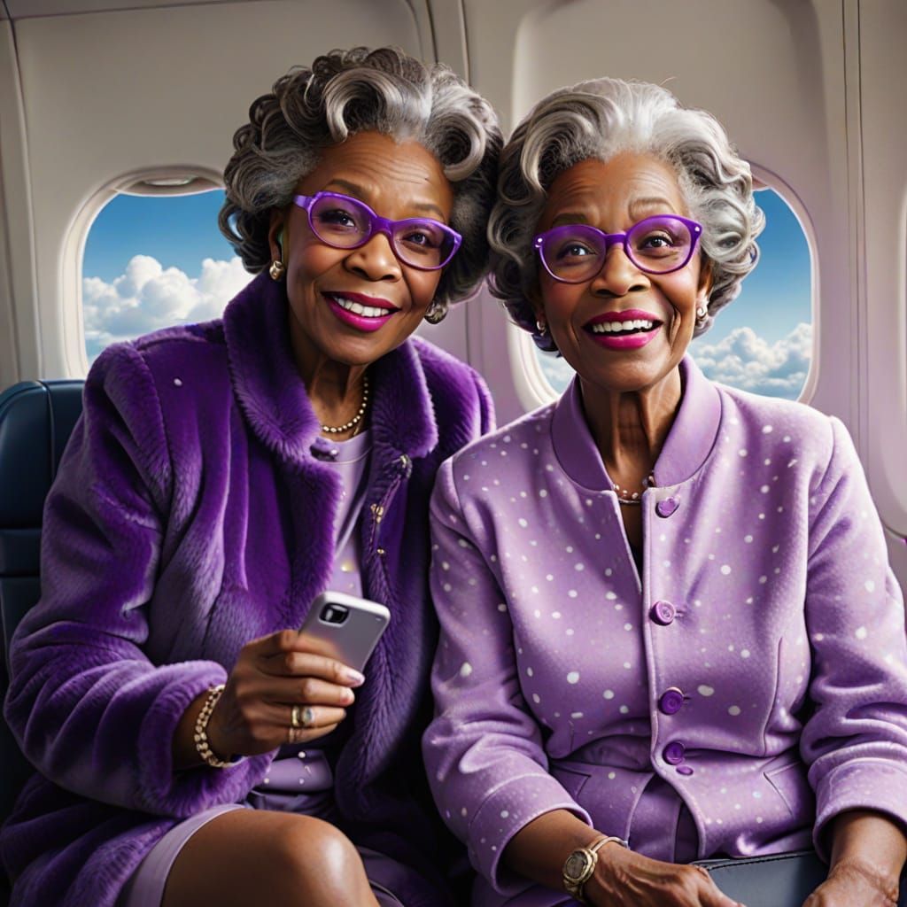 This image shows two stylish, plus-size African-American women in their 60s taking a selfie on an airplane. They sport colorful outfits, bold lipstick, and playful expressions in a cartoon style.