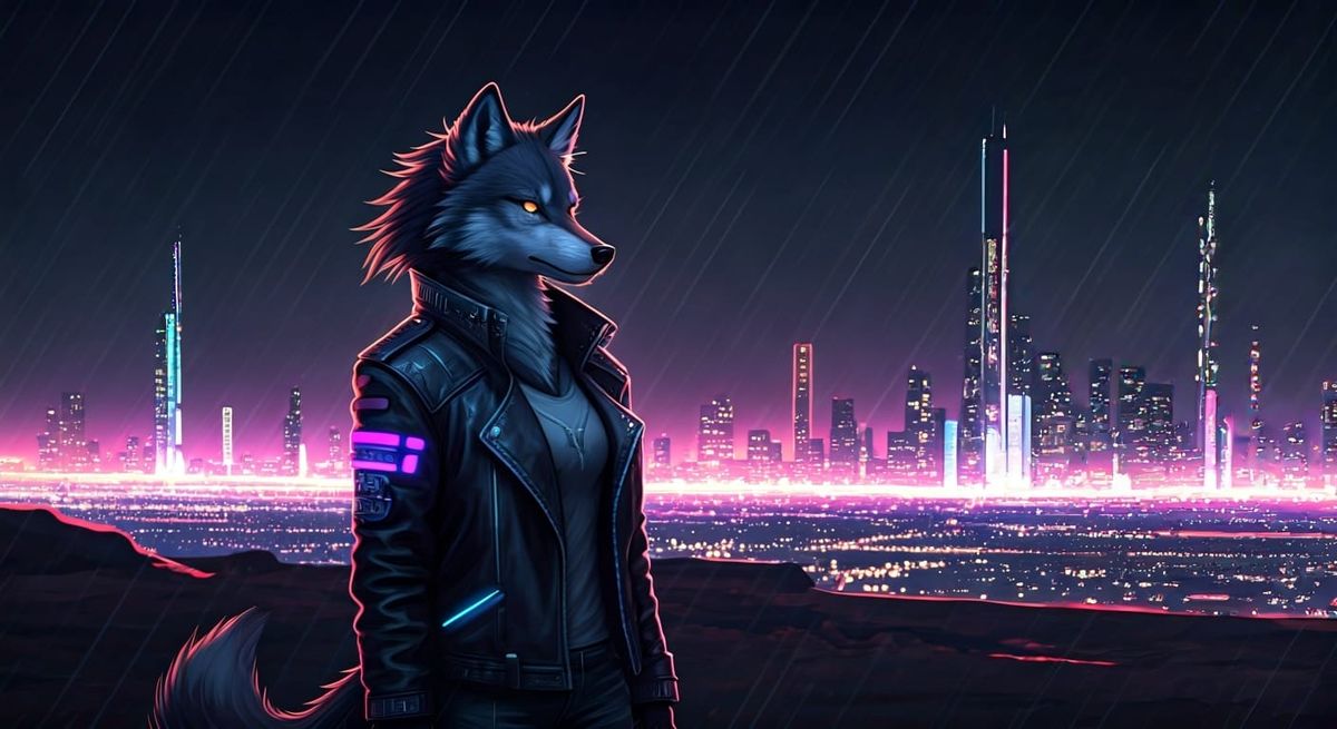 Create your own lone wolf anthro characters in a cyberpunk setting with our free AI image generator.