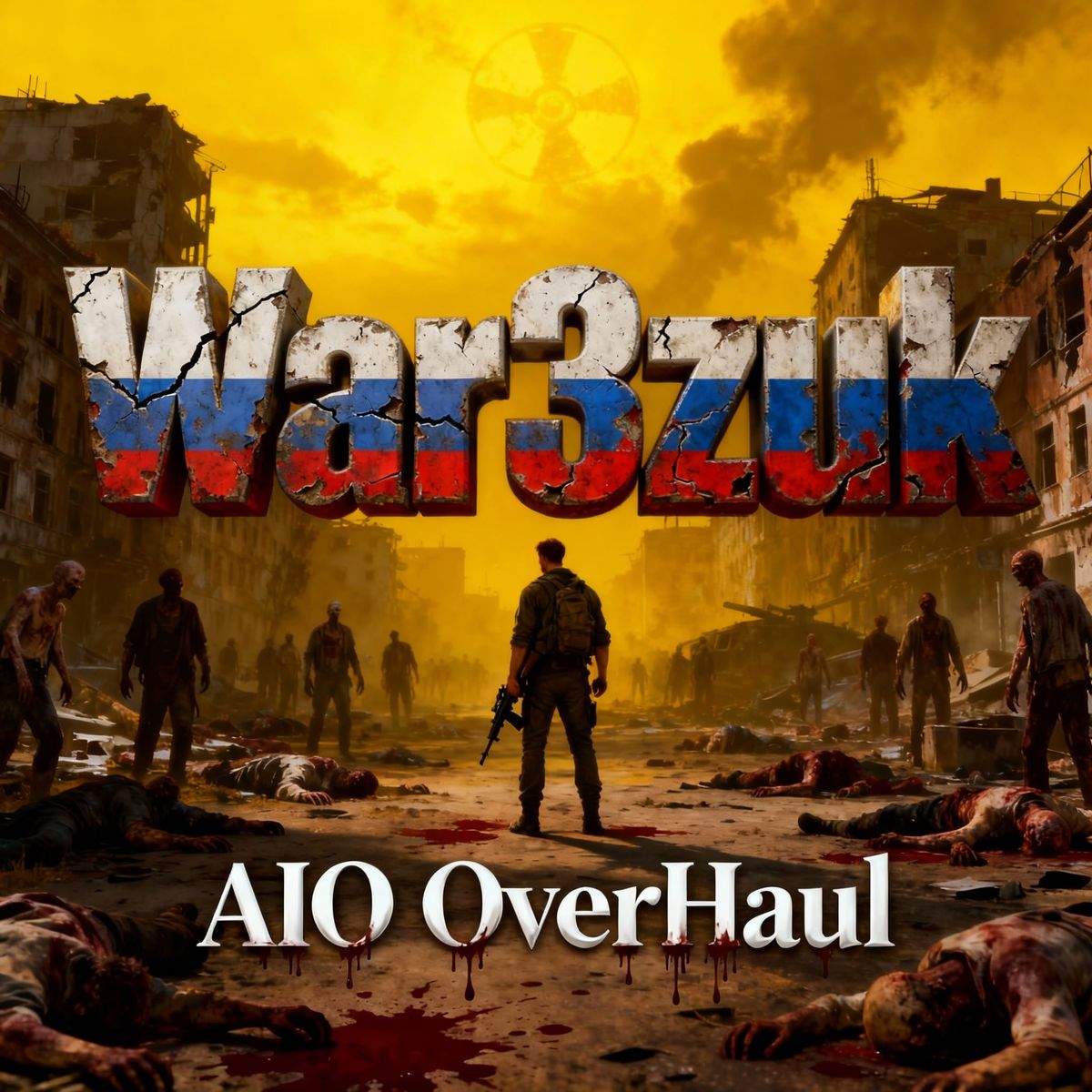 This image depicts a photorealistic post-apocalyptic scene. A lone survivor with a rifle walks through a ruined city under a yellow sky, with signs of destruction and conflict. 3D text elements add a unique graphic detail.