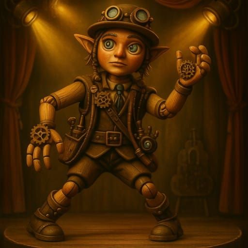 This image shows a steampunk adventurer as a Czech wooden puppet. Carved limbs and painted gears are bathed in a golden spotlight, creating a folk art aesthetic with industrial elements.
