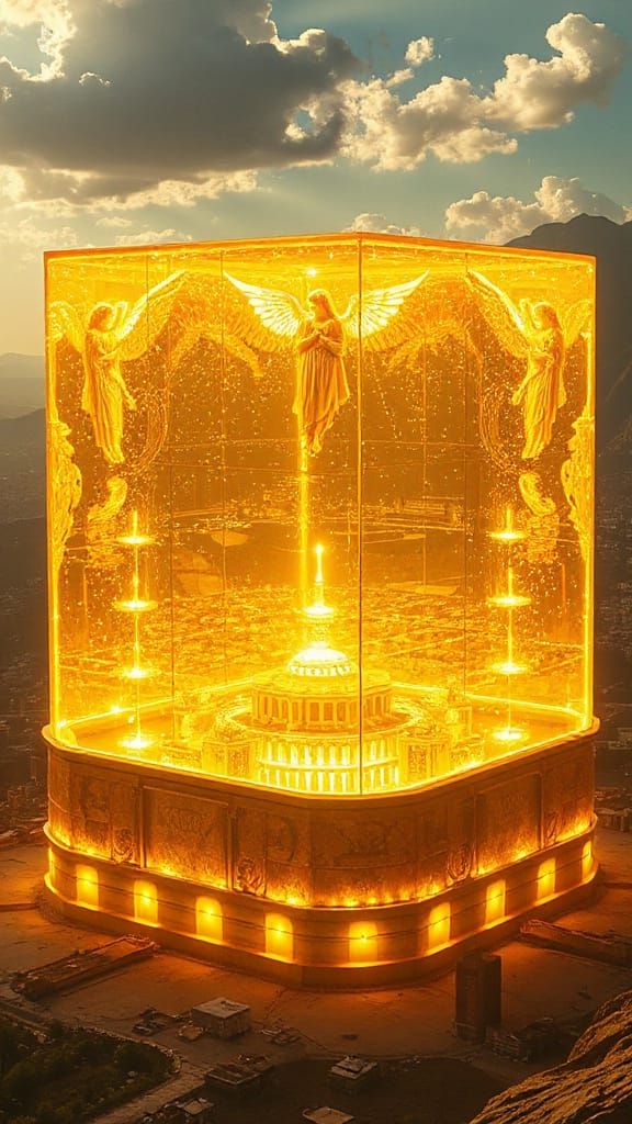 A cinematic film still captures the New Jerusalem, a colossal transparent gold cube radiating divine light. Its jasper walls, pearl gates, and gemstone foundations showcase a glowing inner metropolis.