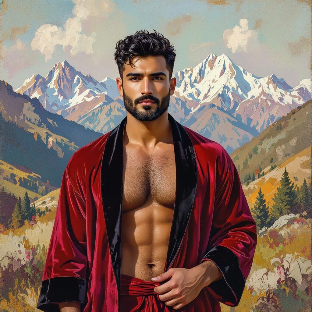 A striking portrait of a Turkish Indian man in a red robe against a mountain backdrop. The image blends golden backgrounds and dynamic lighting in an impressionistic style.