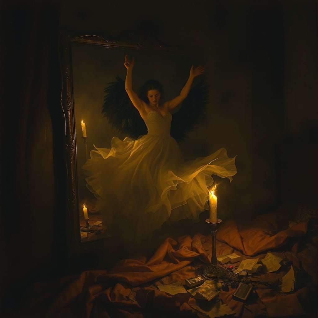 A dramatic scene with a candlelit mirror reflecting a dancer. The image evokes a gothic horror style with detailed line work and strong contrasts.
