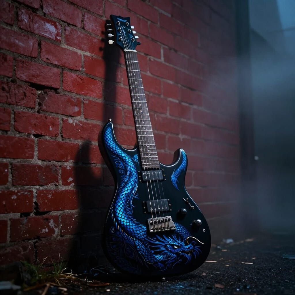 A Neo Black 'Lightning' electric guitar features a coiled blue dragon design, leaning against a foggy brick wall. Moody concept art with cinematic lighting highlights sharp details and vibrant colors.