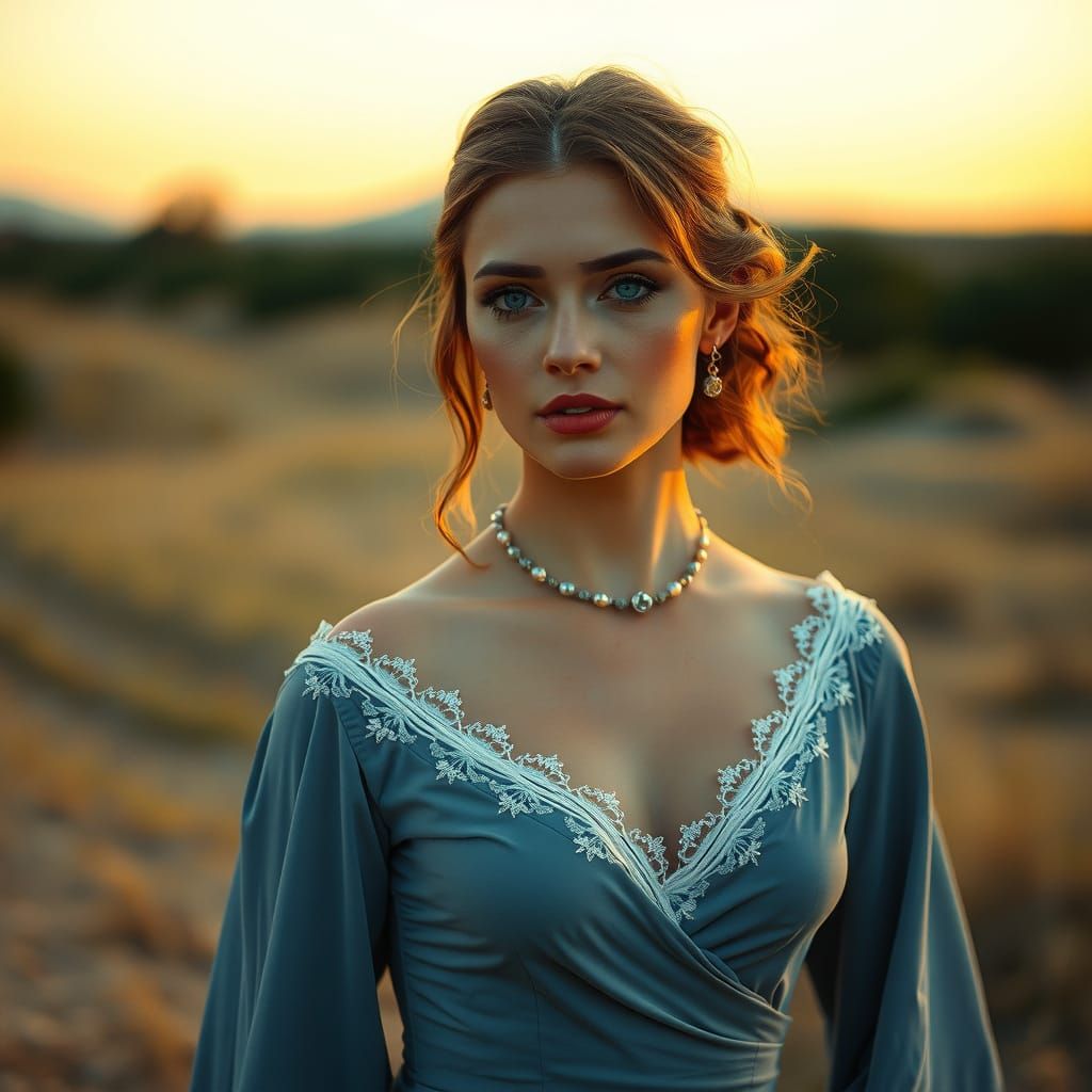 This image shows a woman in elegant clothing posing in a dramatic outdoor setting. The composition features sharp focus, cinematic lighting, film grain effects and color grading, creating a realistic, film-like aesthetic.