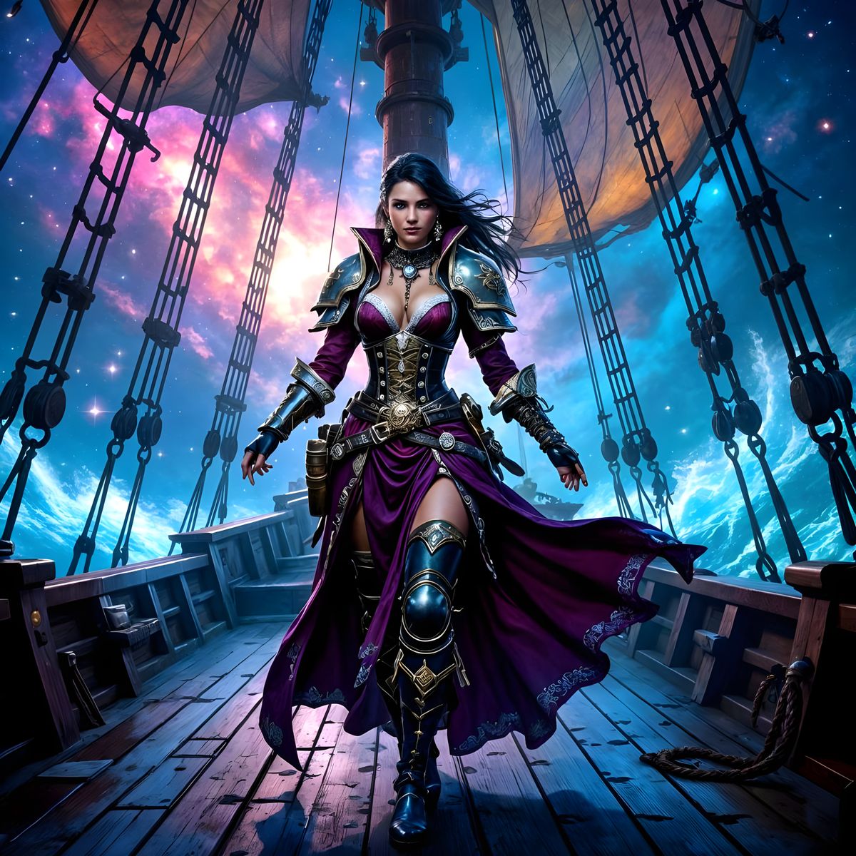 A majestic female pirate with intricate beadwork adorning her attire, standing on the deck of a galleon sailing through a nebula. The ship's sails are tattered, catching the cosmic winds. Stars and nebulae swirl around her, casting an ethereal glow. Detailed matte painting, hyperrealistic, cinematic ...