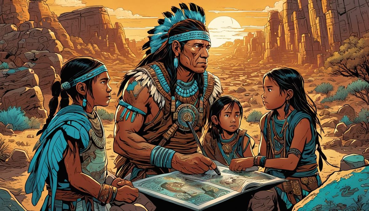 A comic book style image of a Native American father teaching his children. Ancient petroglyphs and turquoise artifacts surround them in the golden light of the setting sun. The art is vibrant and highly detailed.