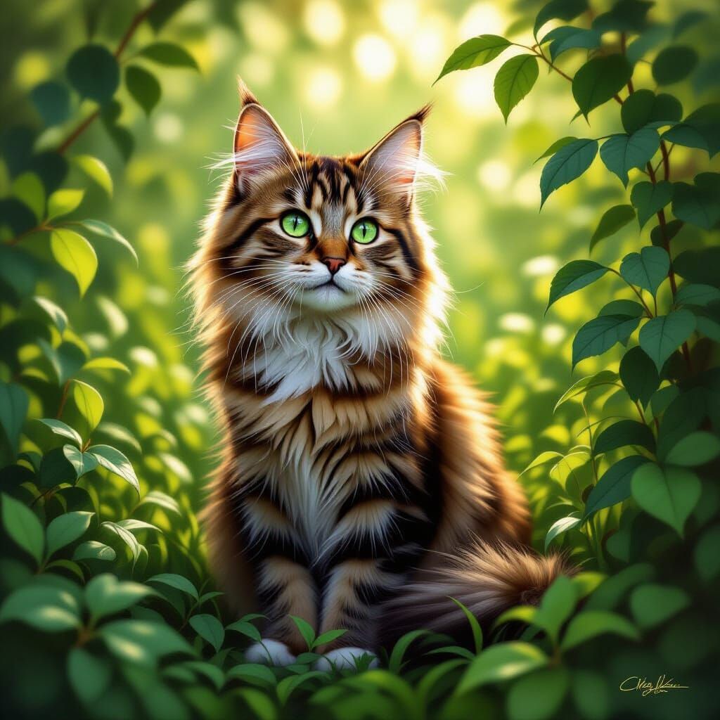 This image shows a detailed digital painting of a fluffy tabby cat with green eyes, sitting alertly in lush, sun-dappled undergrowth. Realistic fur texture and environmental detail are emphasized.