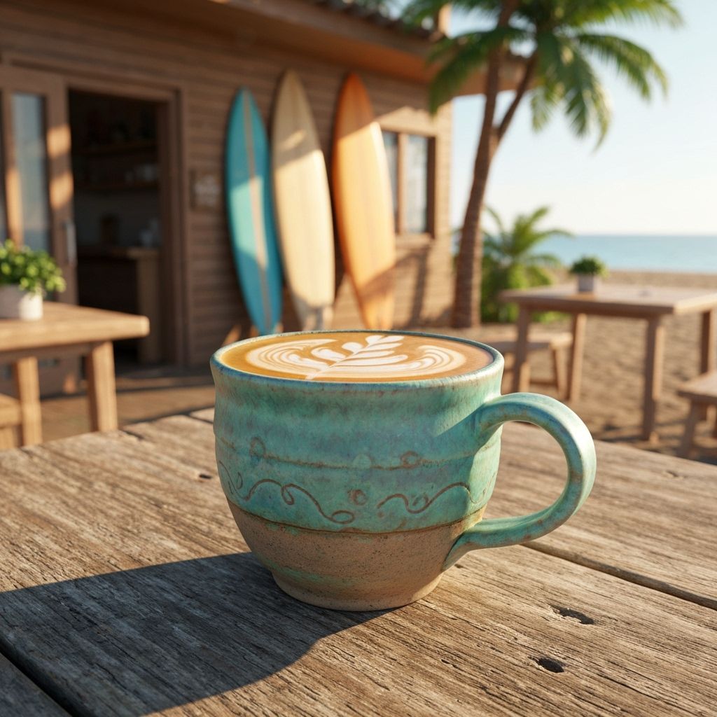 This image showcases a latte with intricate beach-themed latte art served in a handmade aqua mug. The setting is a rustic beachside cafe with surfboards and tropical plants, rendered in a detailed 3D anime style.