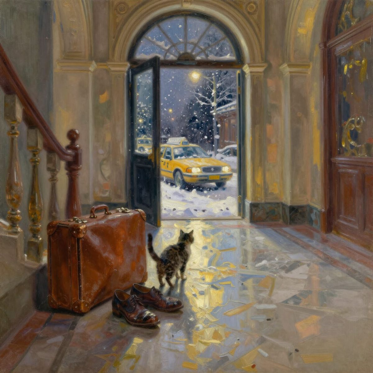 This image depicts a vintage leather suitcase and men's shoes on a marble floor in a grand foyer. A cat approaches, with a snowy night visible through a doorway, rendered in a textured, impressionistic oil painting style.