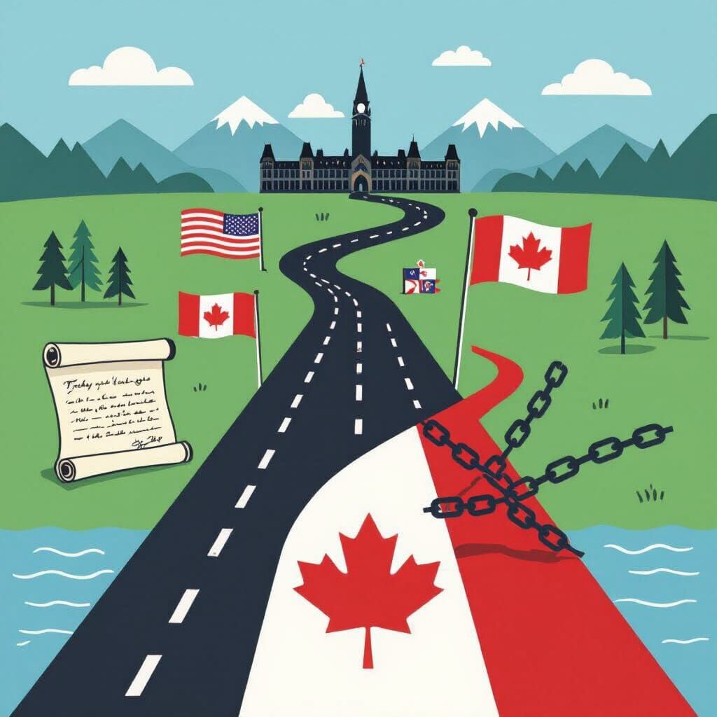 This detailed illustration visually narrates Canada's path to independence, from early treaties to the adoption of its flag, in a vintage map style with deep blues and sepia tones.