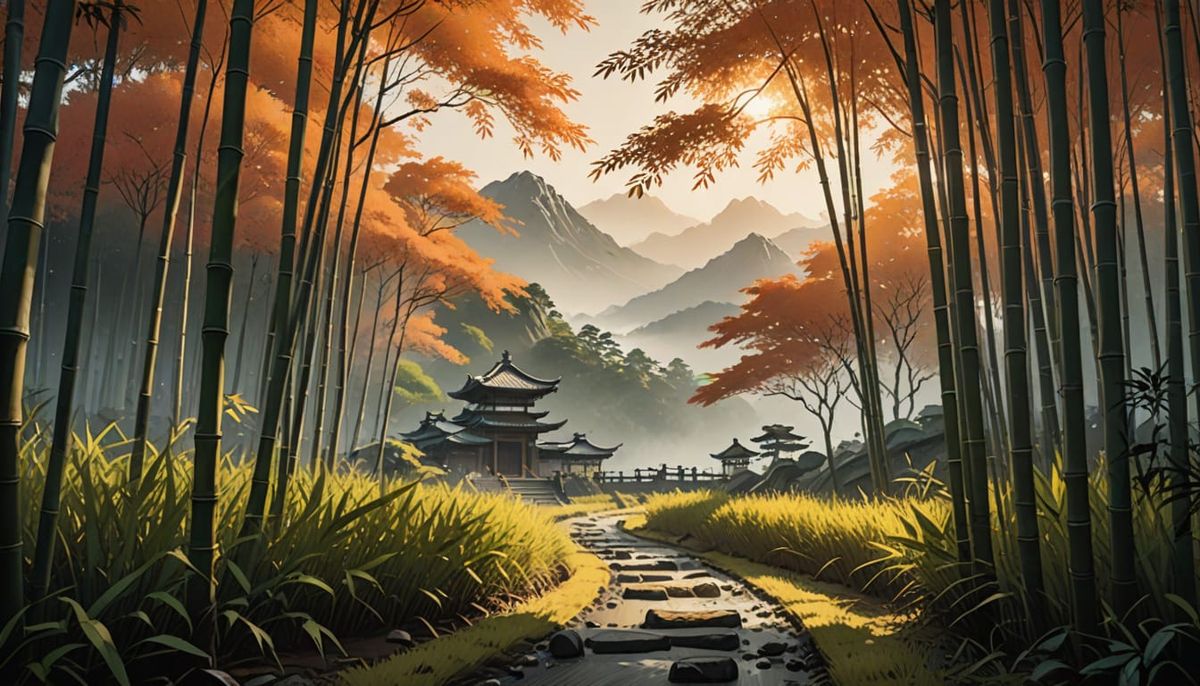 This image shows a cinematic scene of a blade cutting through bamboo in feudal Japan, with dramatic golden hour lighting and mist. It features a vibrant autumn palette and Japanese ink wash influence.