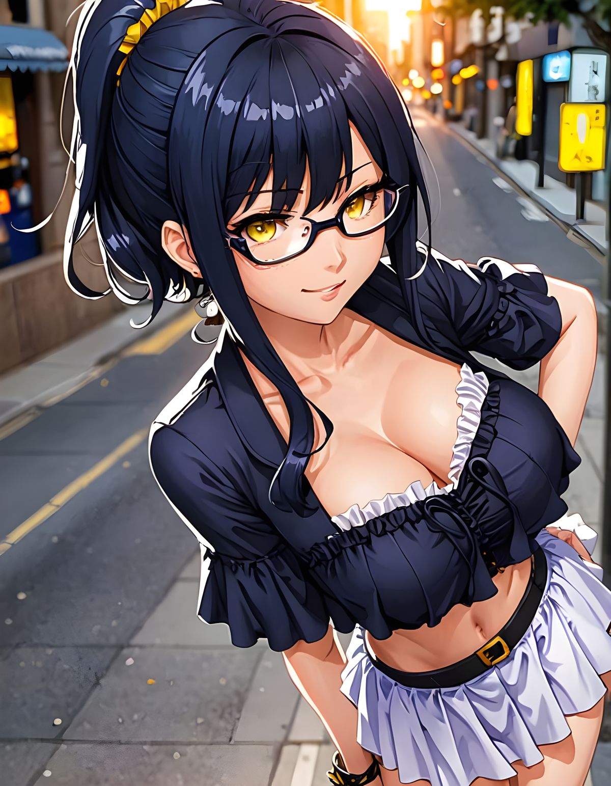 This image shows a girl with long black hair and yellow eyes in a frilled corset and mini skirt walking on a city sidewalk. The artwork is in a manga anime style.