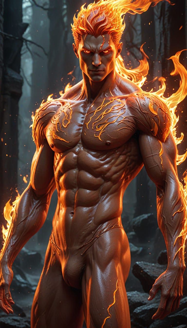 This image showcases a handsome male fire spirit with a slender, muscular physique and a divine, glowing aura. Rendered in a highly detailed anime style with raging red and orange flames.