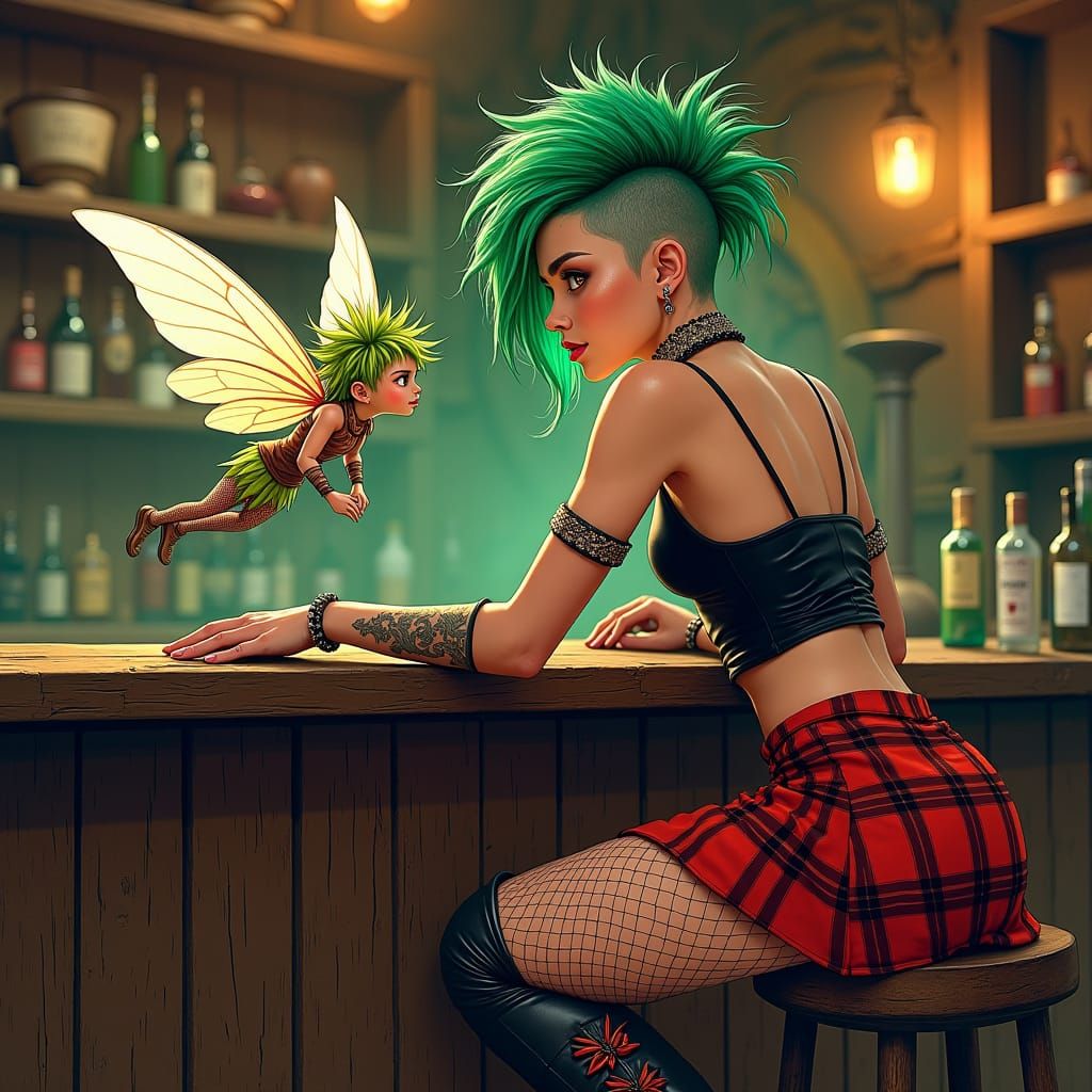 This image shows a punk woman with a green mohawk in a fantasy tavern. She wears a red plaid skirt and boots, talking to a pixie with iridescent wings in a whimsical, detailed illustration.