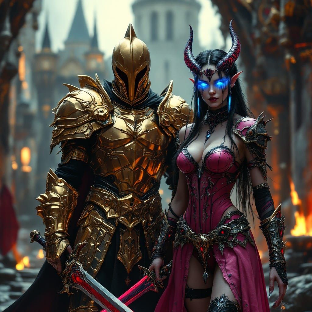 This image shows a goth barbarian and elf rogue in combat poses. They wear ornate armor and wield weapons against a mystical castle backdrop. The scene blends dark fantasy with futuristic elements as digital art.
