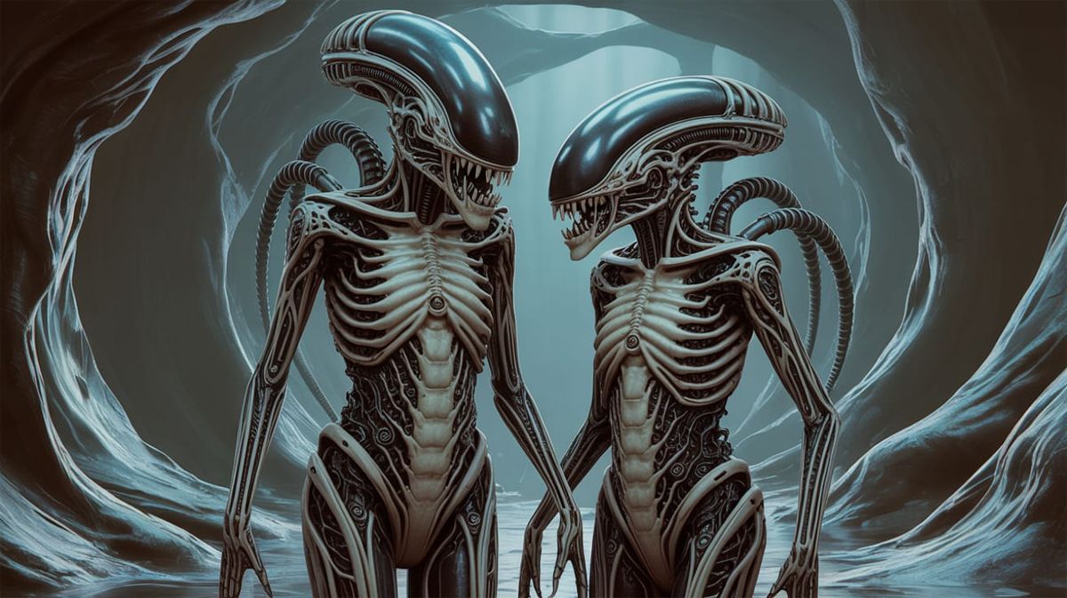 This image shows two biomechanical xenomorph twins in a cavernous chamber. Their bodies are a fusion of organic and metallic elements, with surreal clockwork details and glowing veins, in a Giger-esque style.