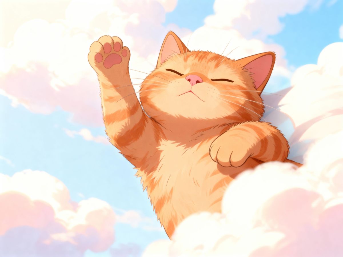 Anime Tabby kitten sleeping on a background of gradient looking clouds.