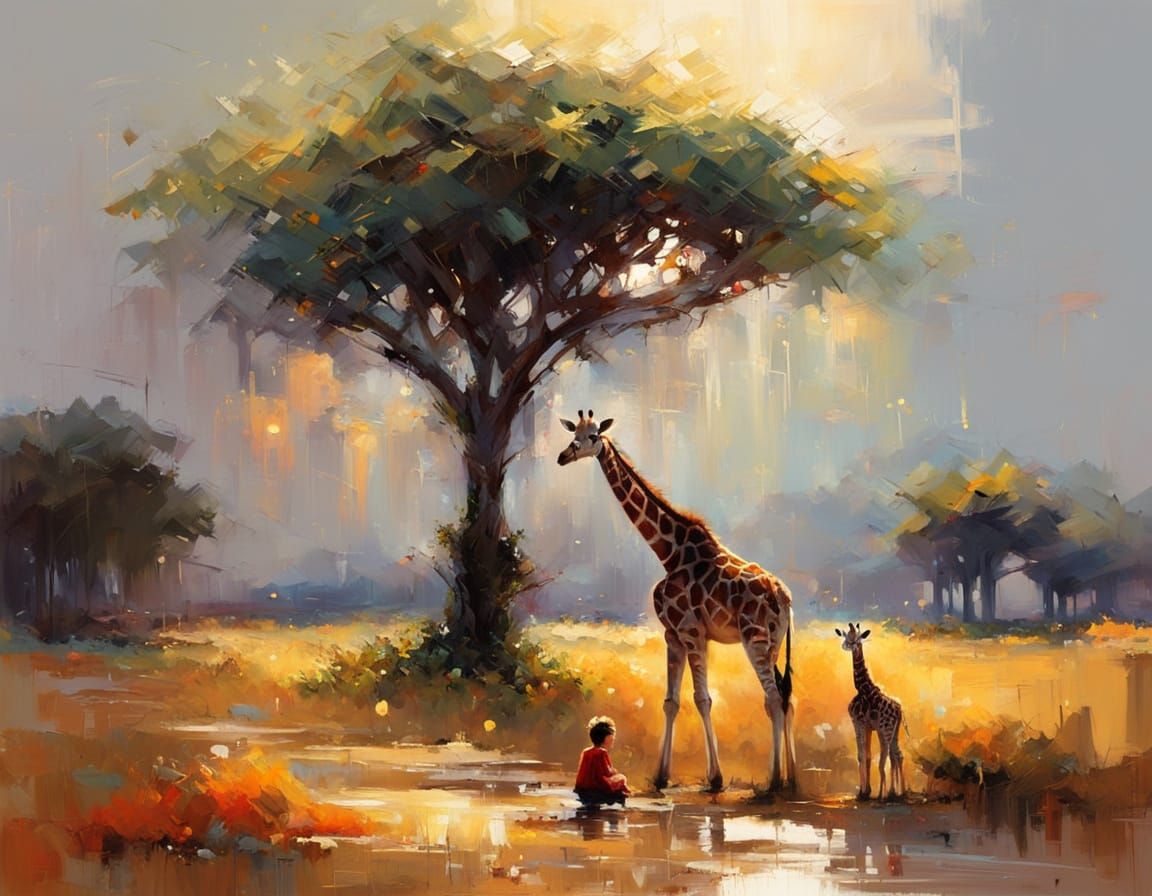 This image shows a heartwarming scene of a baby giraffe and his mother in a vibrant African landscape, depicted in a realistic oil painting style with warm colors and soft lighting.