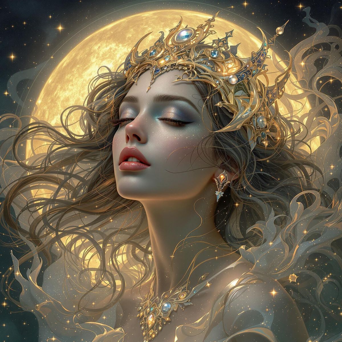 This image shows a moon princess with a crown, in a luminescent sea. The portrait is highly detailed with vibrant colors and intricate textures, reminiscent of art nouveau, trending on Artstation.