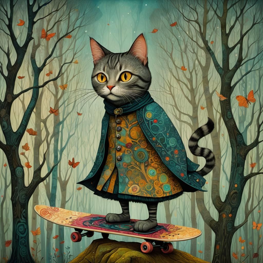 A surreal image of a woman with feline features in an art brut style. The piece evokes a dreamlike quality with bright, delicate pastel colors. This artwork blends symbolic and fantastical elements.