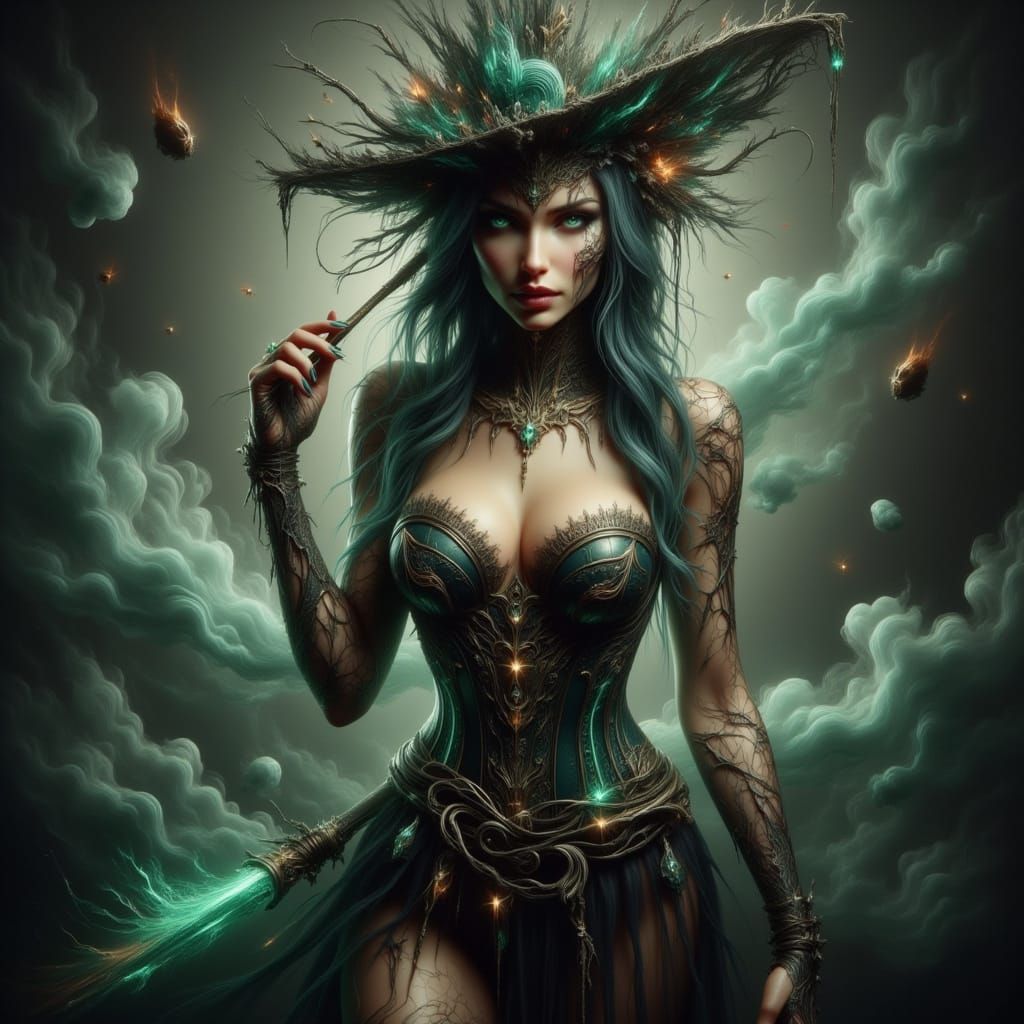 This image depicts a sultry and mysterious voodoo-steampunk hybrid, adorned with corset, bone charms, and lace gloves, surrounded by an eerie green glow and wisps of smoke. She embodies the essence of Creole Louisiana heritage, exuding a sense of swagger and ethereal magic.