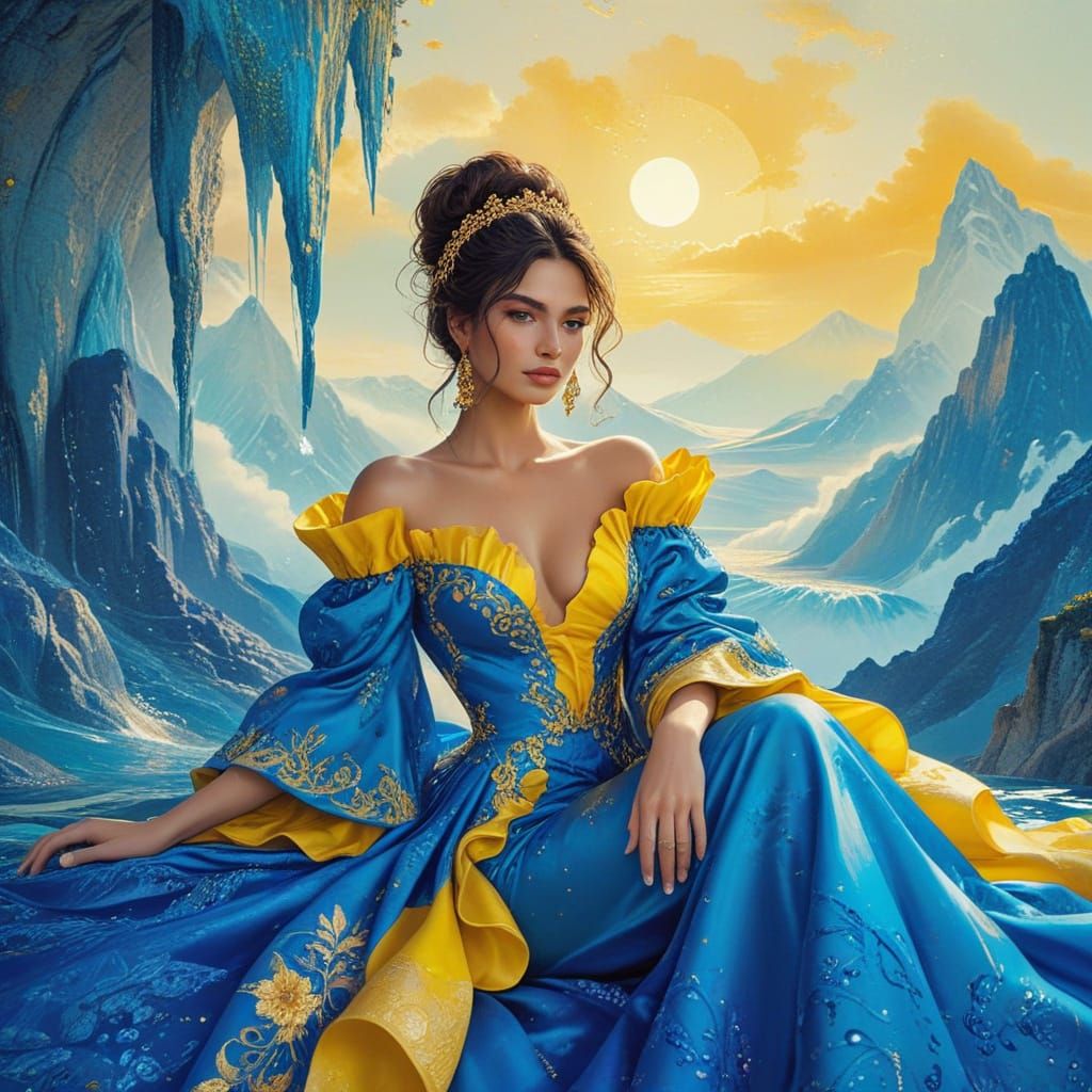 This image shows a luxurious evening gown with intricate gold embroidery and sharp fabric textures. Facial features are enhanced with sparkling jewelry highlights against a backdrop of reflective mountains and sky.