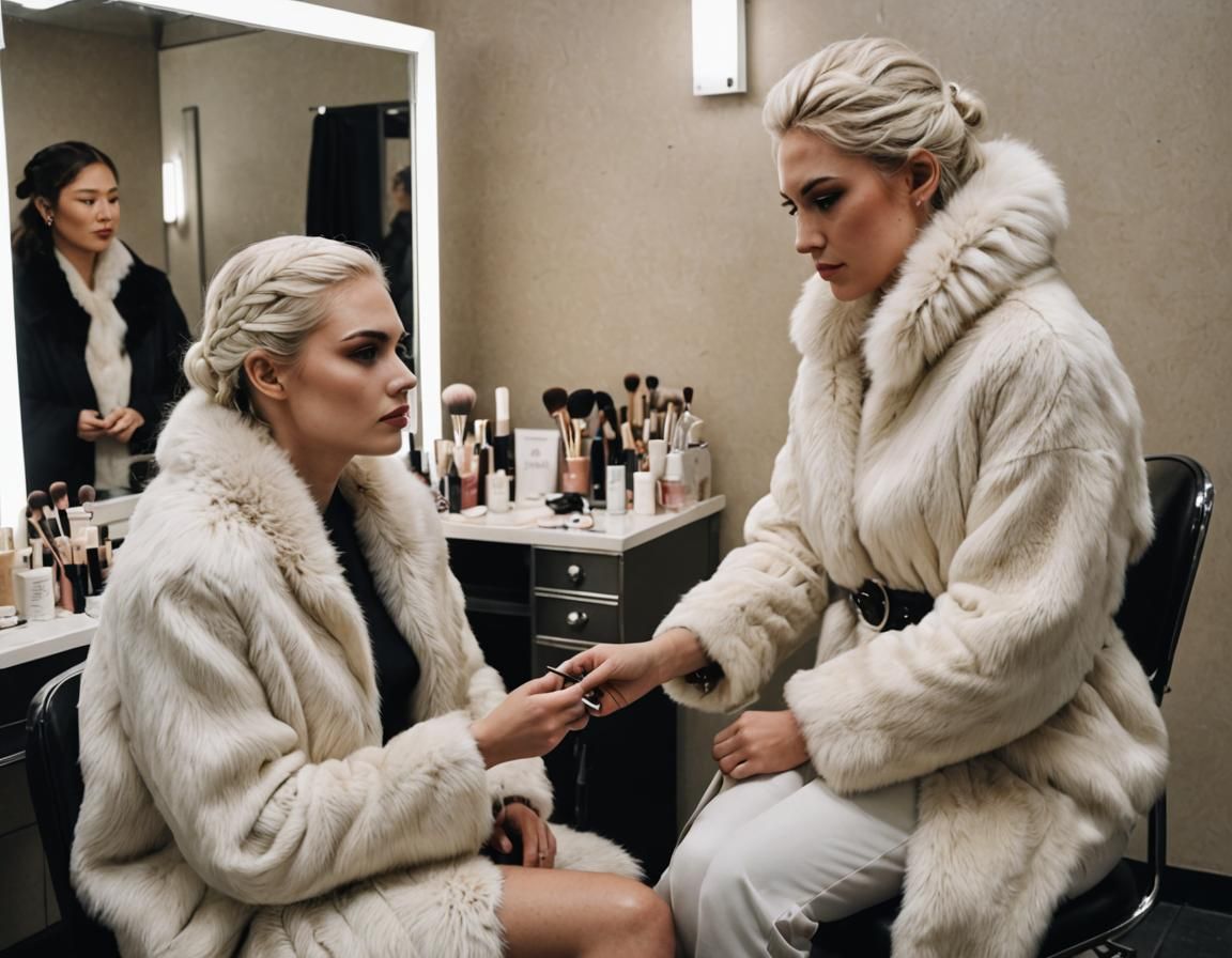 This image depicts a young woman undergoing a striking transformation in a dressing room. Her face is skillfully made up to resemble a white wolf, blending human beauty with animalistic features in a cinematic style.