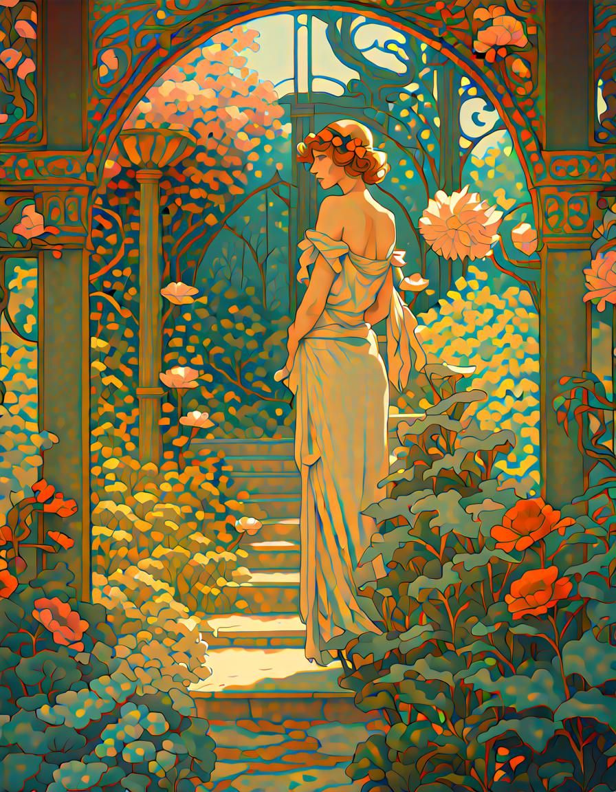 A vibrant art deco painting of a secret flower garden. The composition features deep colors and textures reminiscent of gouache and matte painting techniques.