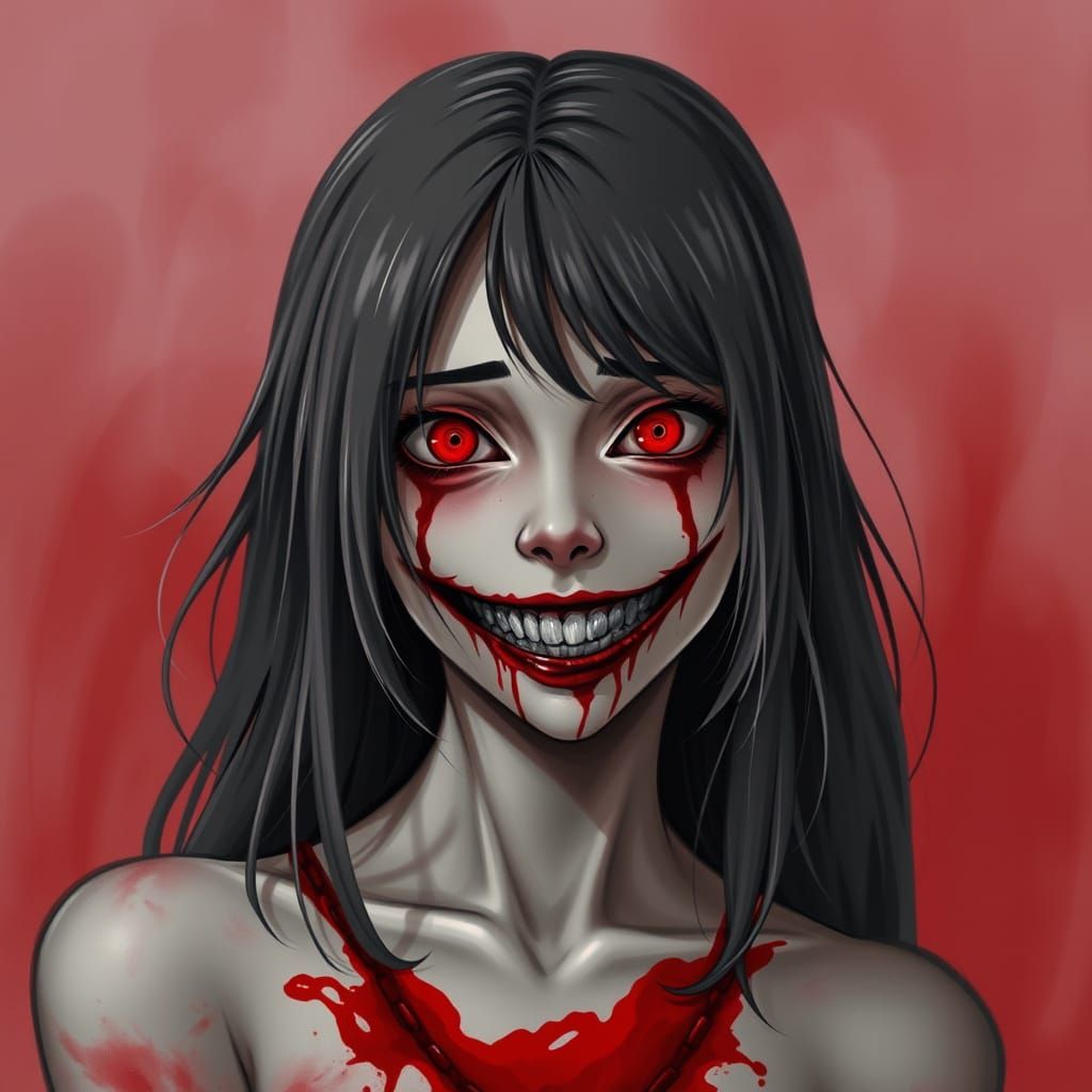 This image depicts a young girl with striking red eyes and a bloody smile, created in a dark and ominous gothic aesthetic.