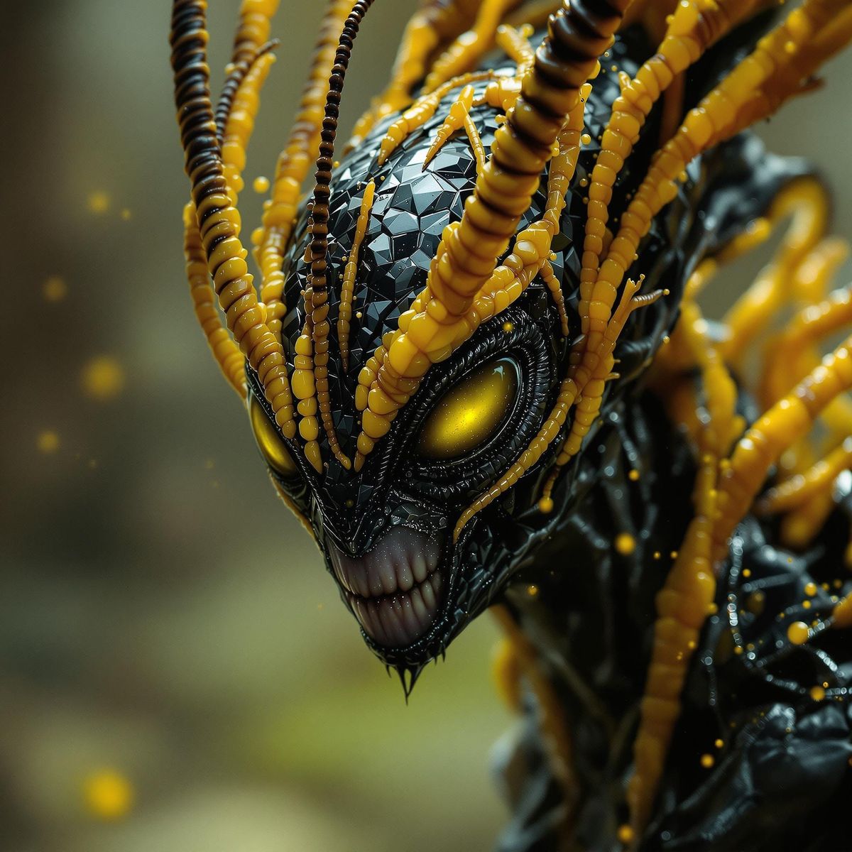 This image shows a striking, feral alien woman with black and yellow fur and insect antennas. The digital art features dramatic lighting and a soft painting style in a macro view.