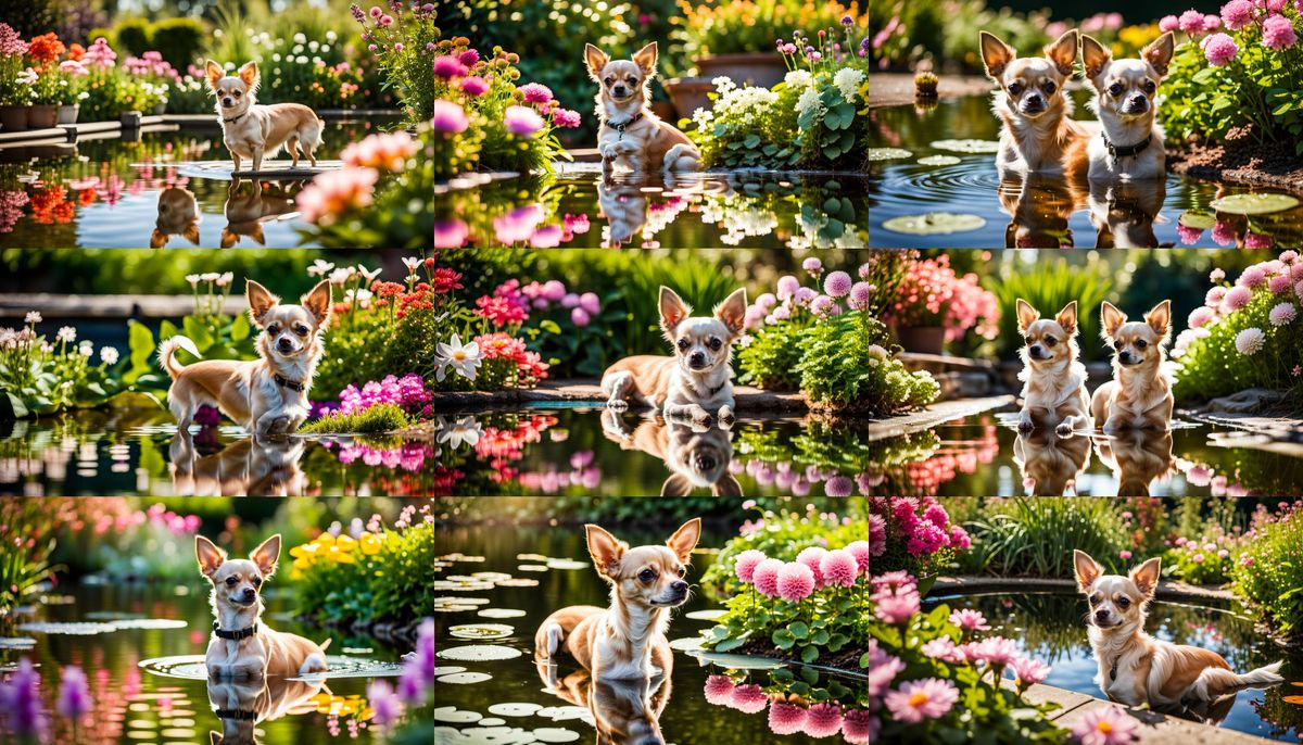This image shows a Chihuahua dog gazing dreamily at its reflection in a garden pond, surrounded by lush flowers and greenery in bright sunlight.