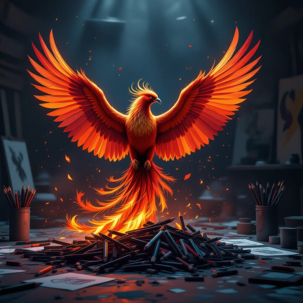 This image shows a phoenix with ink and pencil shaving feathers emerging from discarded pencils in a studio. Art style blends dark fantasy and surrealism with dramatic lighting.