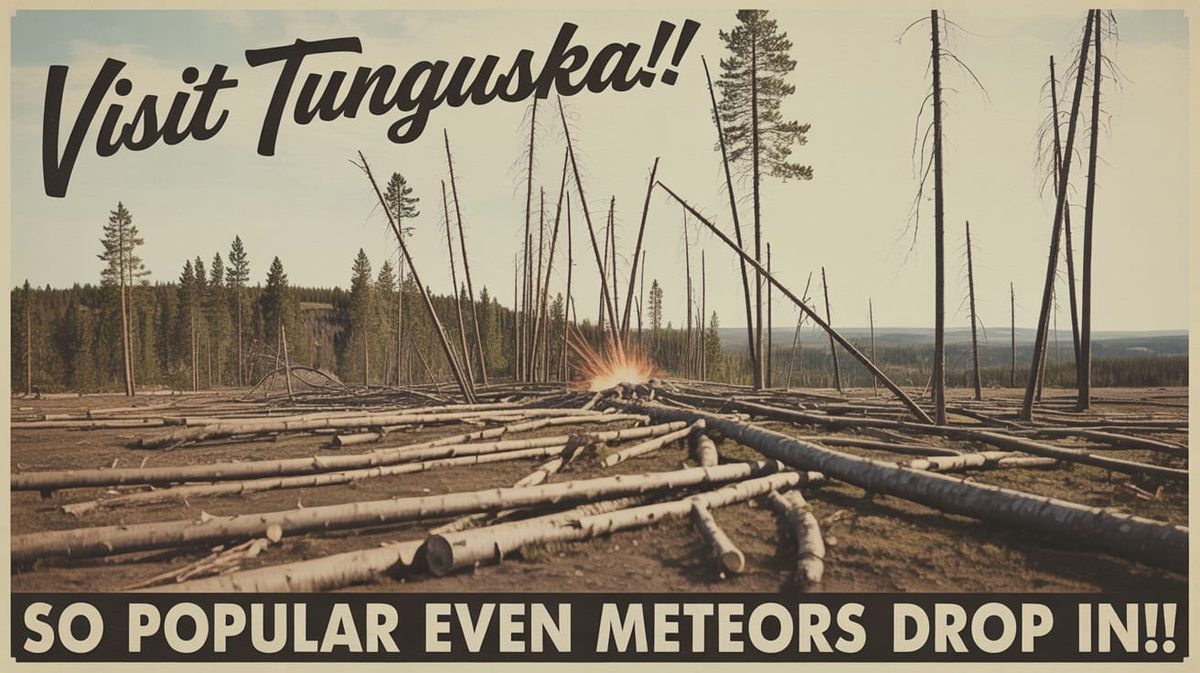 A 1960’s style Travel Poster advertising the 1908 Tunguska Meteor Impact site showing trees knocked down and fanned out from a centerpoint. At the top of the poster in script are the words “Visit Tunguska!!” And along the bottom end of the poster are the words “So Popular Even Meteors Drop In!!”