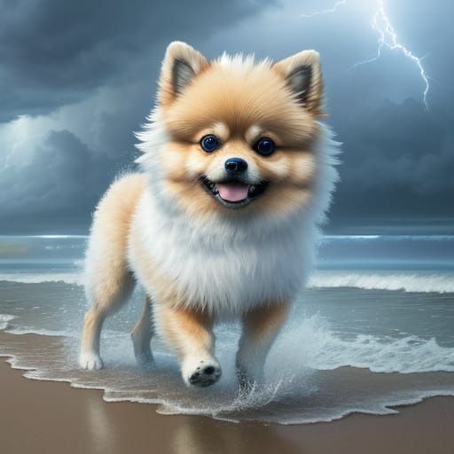 This image captures a fleeting moment of a Pomeranian running on a sandy beach, surrounded by dark stormy clouds and dramatic lightning. The oil painting style brings to life the furry texture and vibrant colors of the scene, evoking a sense of seaside atmosphere and dramatic weather.