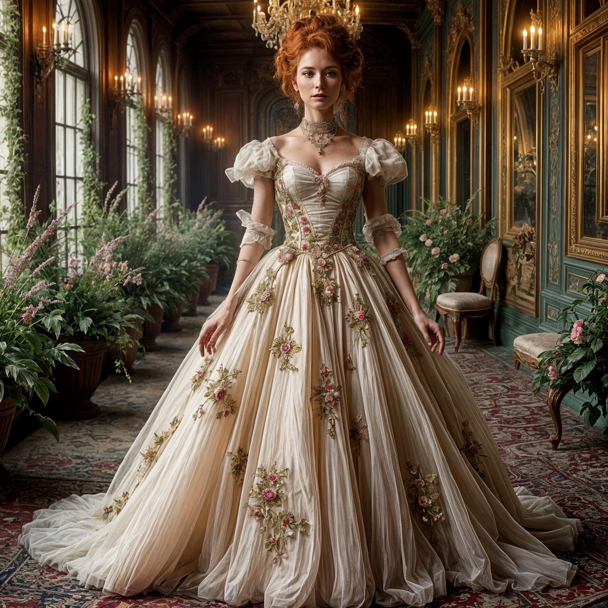 A stunning portrait of a red-haired woman in a luxurious 1890s ball gown, evoking the romance and opulence of the Victorian era.