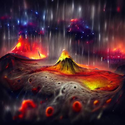 This image shows a surreal landscape of a volcano erupting under a rain of cosmic particles, creating a dramatic and otherworldly scene.