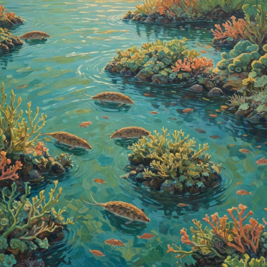 This image shows sea mice swimming through a vibrant coral reef. The scene is rendered with soft brushstrokes and a golden hour palette, in an impressionistic style.
