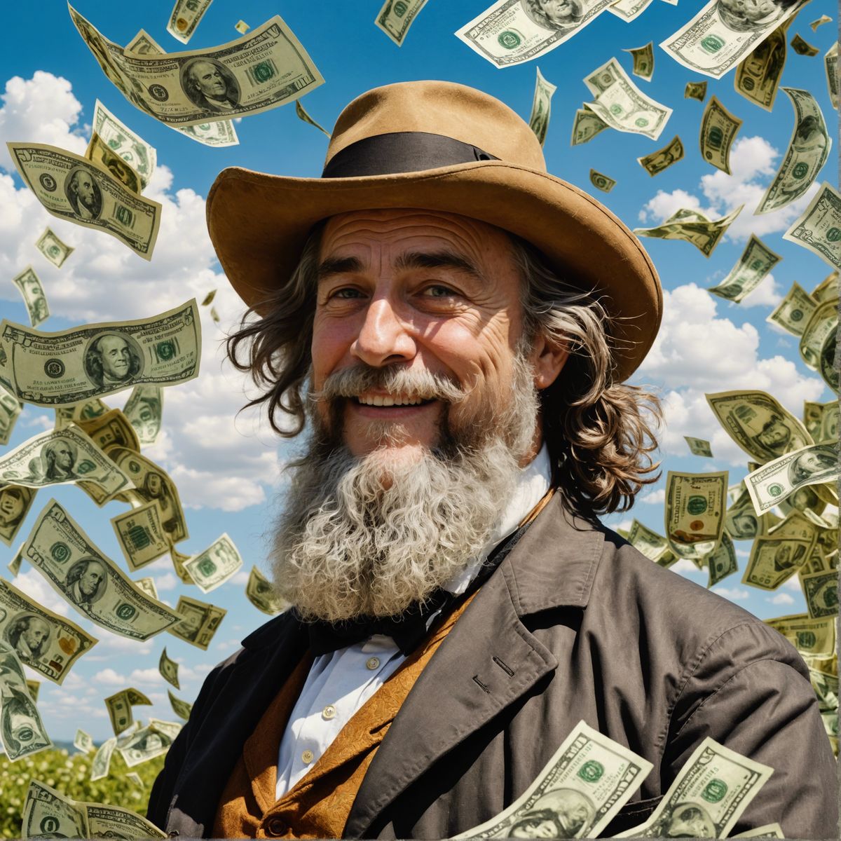 This image shows a hyperreal portrait of a smiling artist surrounded by money. The artwork is rendered in a romantic watercolor style, capturing a sunny and cheerful scene.