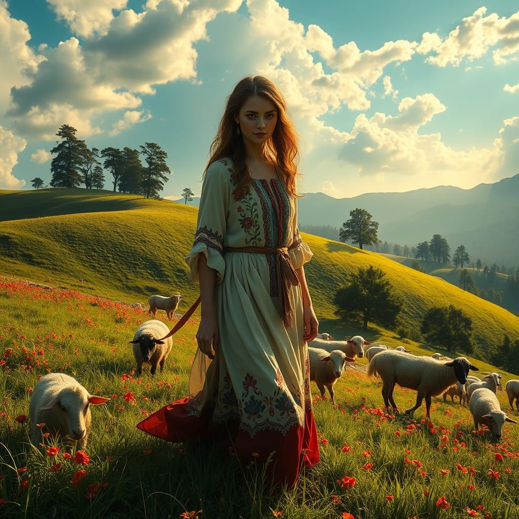 This image depicts a serene shepherdess amidst a vibrant landscape, surrounded by rolling hills and majestic trees, in a style reminiscent of epic cinematic digital art