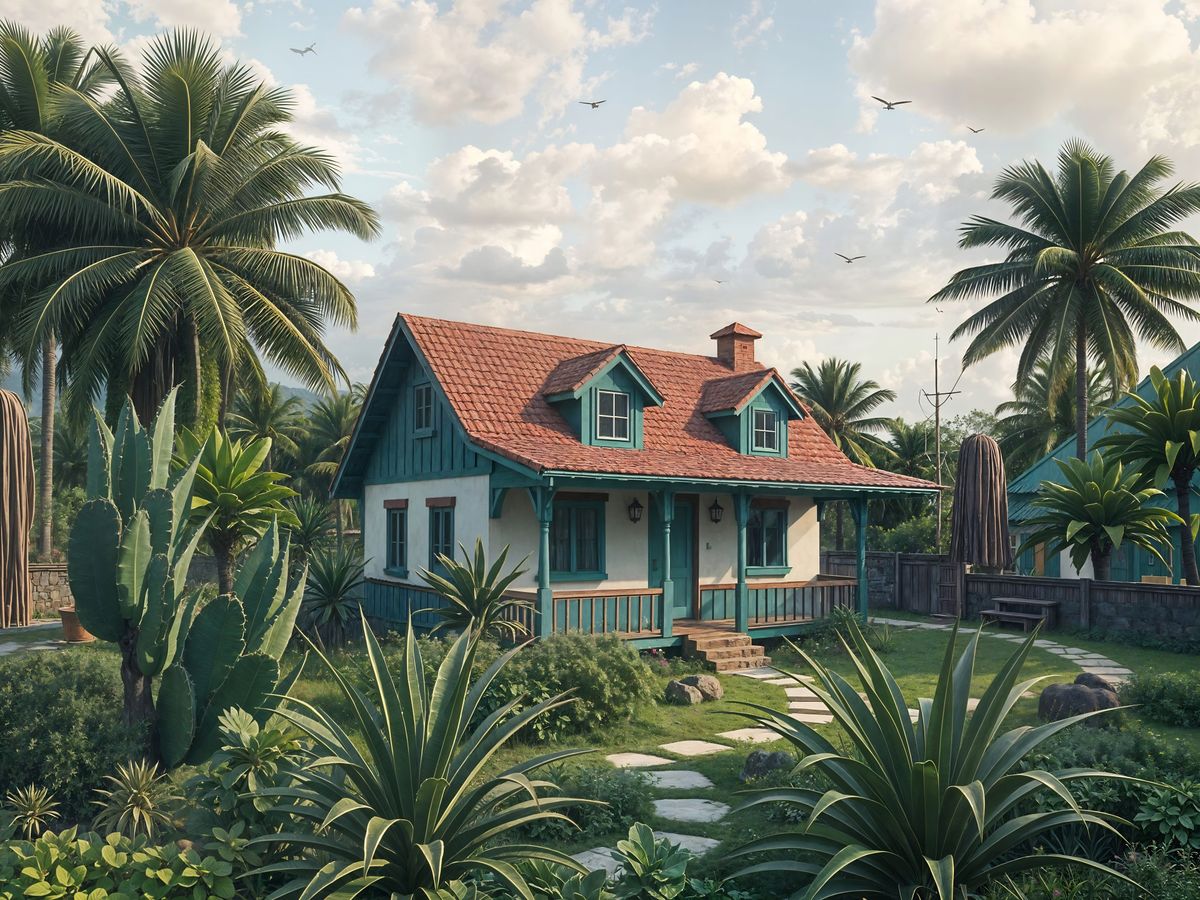 A striking digital artwork of an Aruban Cunucu house in a tropical garden setting. The Caribbean architecture is rendered in vibrant colors and meticulous detail, reminiscent of concept art.