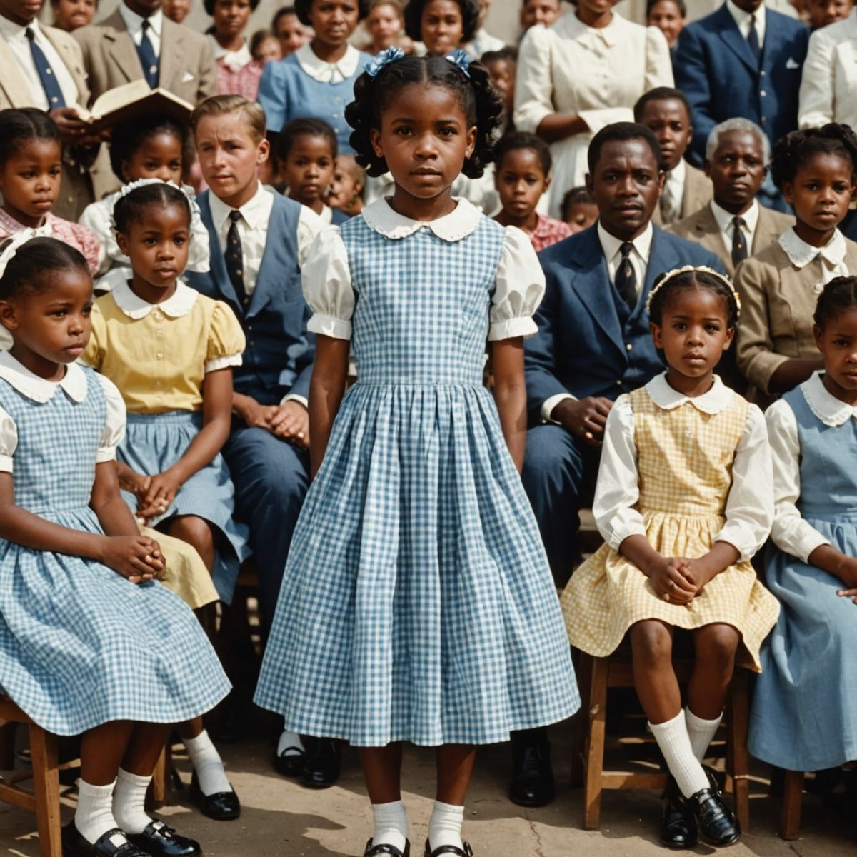 This vintage image captures a young Black girl delivering her Easter speech in a modest 1950s church. Her nervous expression is met with encouraging parents in the front row. The photo has an aged patina.