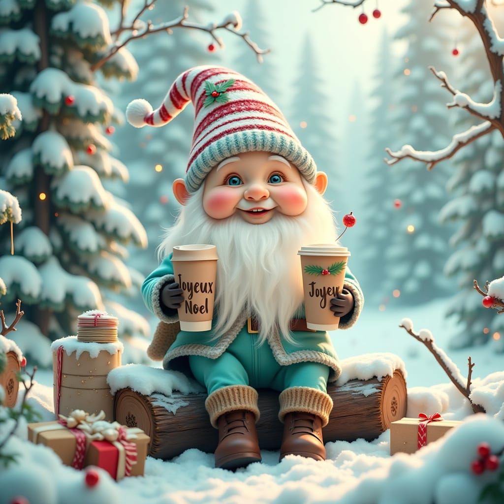 This image shows a joyful gnome with a white beard in an aquamarine winter outfit, holding a hot chocolate. Rendered in a cozy storybook illustration style.