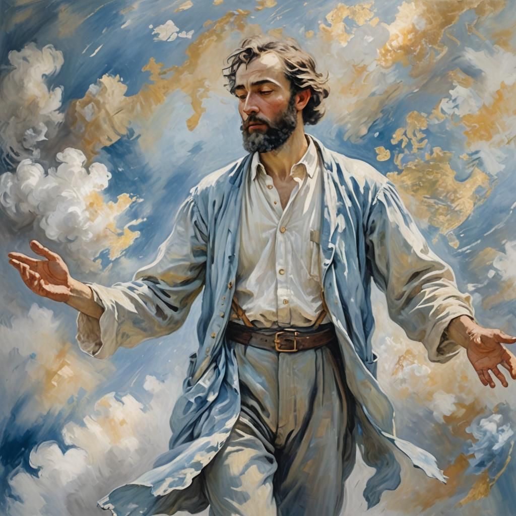 This image shows a lone poet standing drunkenly on a world map with arms outstretched. The artwork is in an impressionistic style with soft brushstrokes, ethereal lighting, and a palette of blues, whites, and golds.