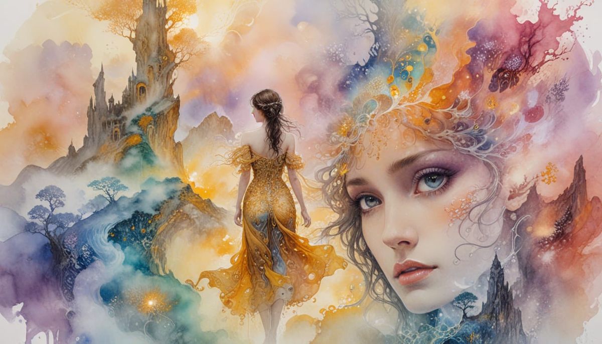 A captivating ink and watercolor wash drawing shows a woman in a fantasy landscape. The artwork features delicate fractal patterns and a vibrant, ethereal background in cool triadic colors.