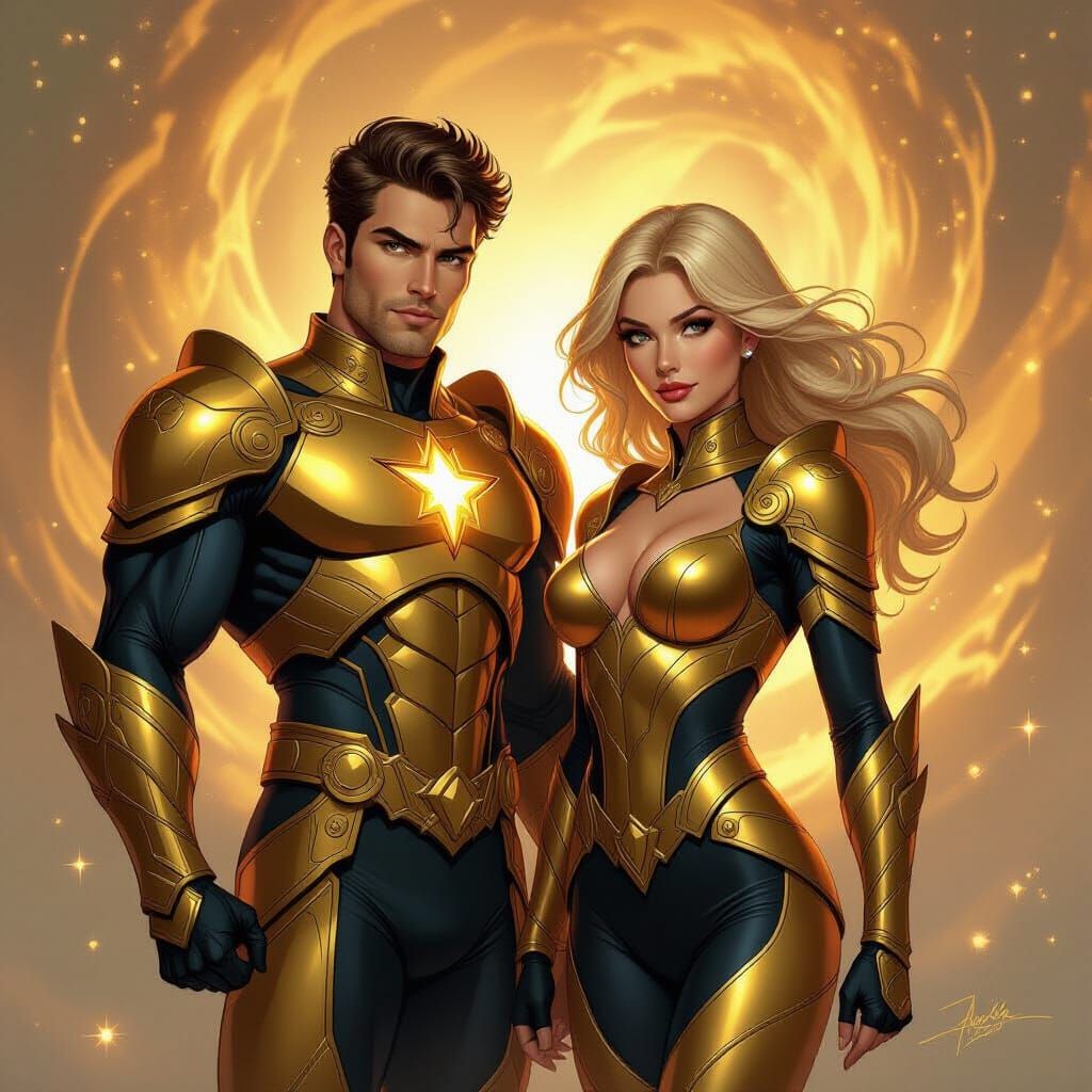 This image features a male and female superhero duo in detailed gold armor, set against a swirling golden nebula. The artwork has a luminous glow and sharp detail, reminiscent of classic comic art.