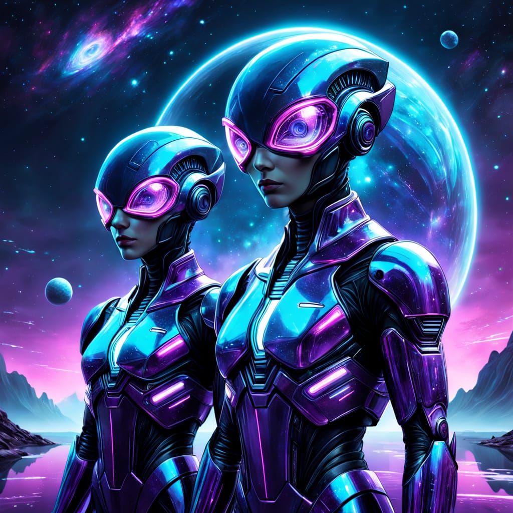 This vibrant illustration captures two young aliens preparing to fly off into the cosmos, surrounded by neon lights, glowing circuits, and a stunning purple and pink color scheme. Set against a backdrop of stars and galaxies, this sci-fi scene embodies the essence of retro-futurism and glitchcore aesthet...