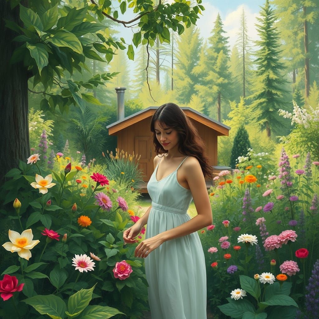 This enchanting image captures a woman surrounded by lush greenery, tending to a vibrant garden amidst a sauna nestled in the trees, evoking the tranquil and dreamy atmosphere of a serene natural escape.