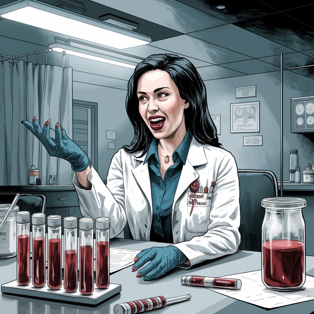 This image shows a detailed, dark fantasy illustration of a vampire lab worker in a modern hospital setting, surrounded by test tubes and plasma bags, adding a touch of Gothic horror to the sterile environment.